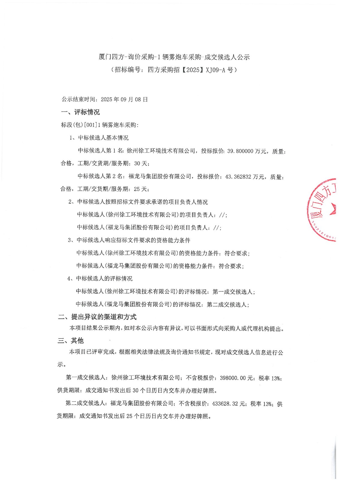 厦门四方-询价采购-1辆雾炮车采购-成交候选人公示