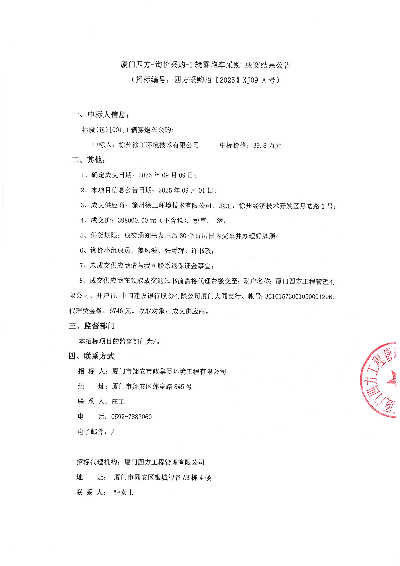 厦门四方-询价采购-1辆雾炮车采购-成交结果公告